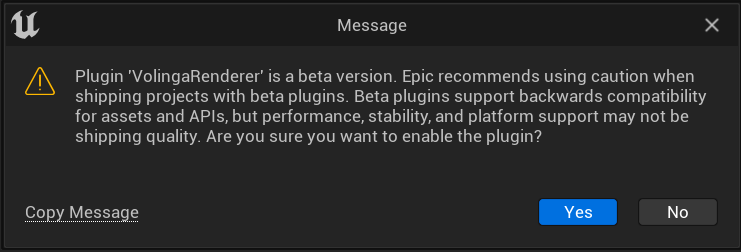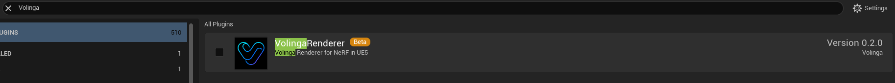 In the plugins window, search for "VolingaRenderer" and enable it by checking the box. You may receive a warning message indicating that this plugin is still in beta.